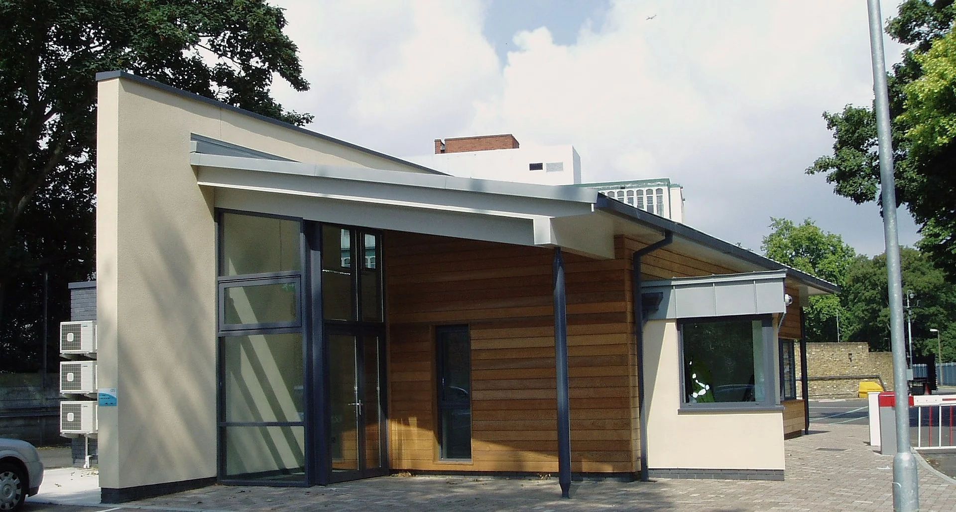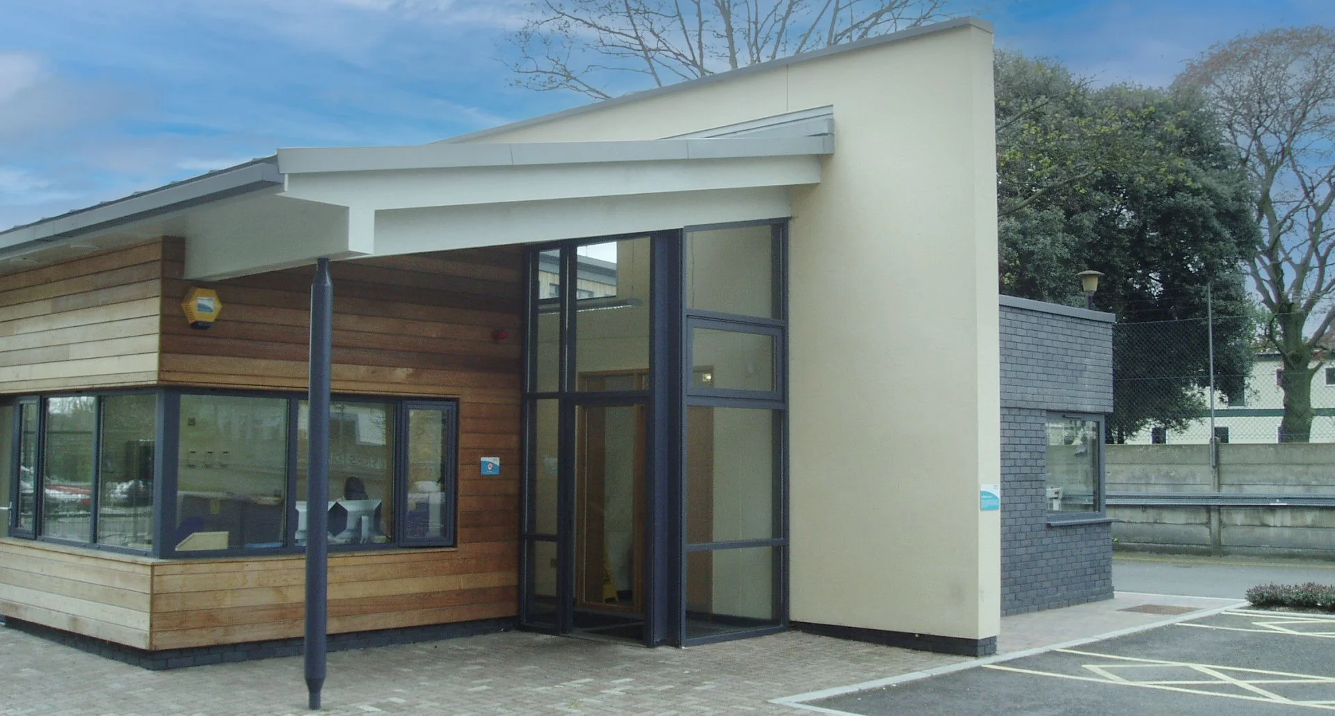 This single storey building has a central corridor at its heart with full height glazing at each end together with clerestory windows above set into within an oversized dividing wall finished in render.