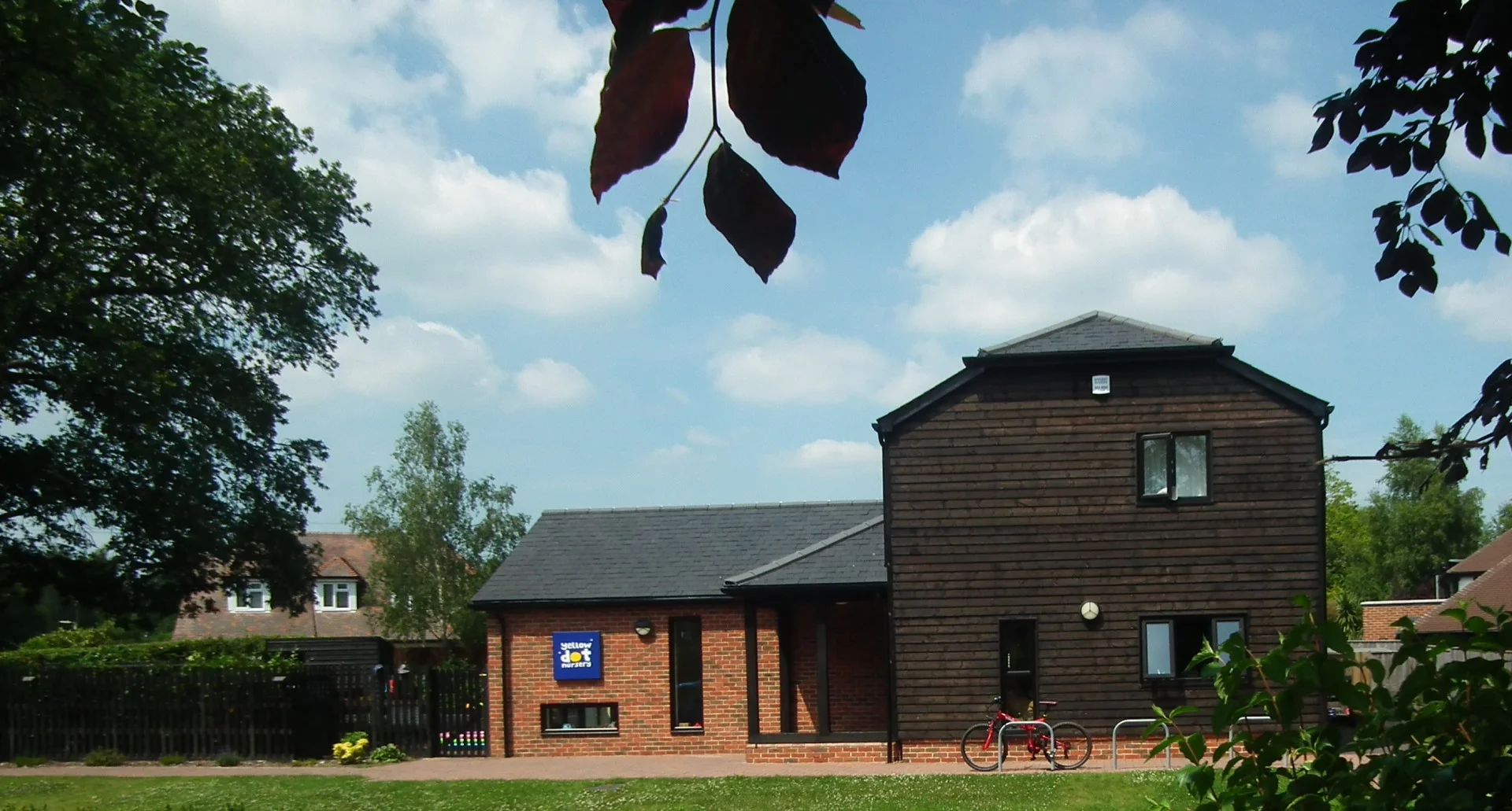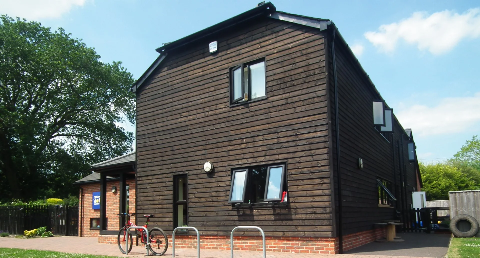 A mature oak tree dominates the centre of the play space and impacted upon the siting of the Nursery. It benefits the nursery by providing shade as well as a strong visual presence and also by mitigating the impact of the adjacent main road as well as the view from the main road, permitting only angled glimpses between undergrowth and canopy.