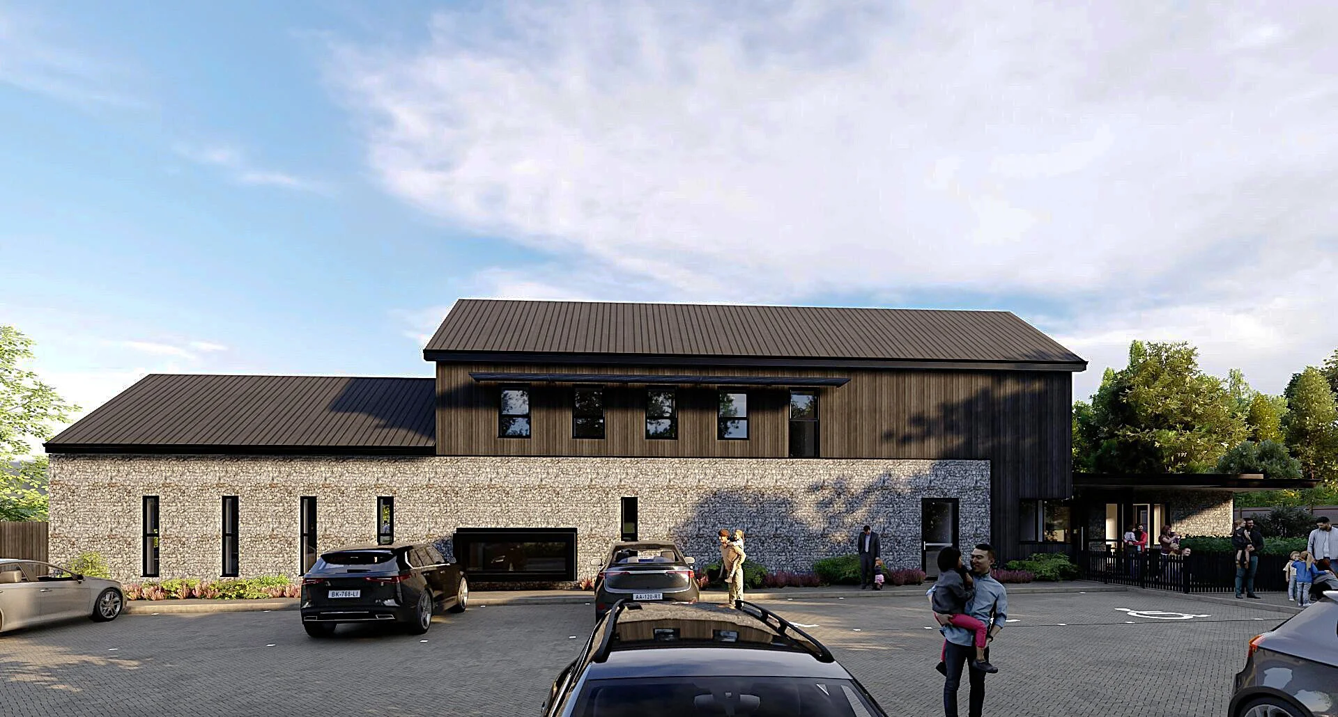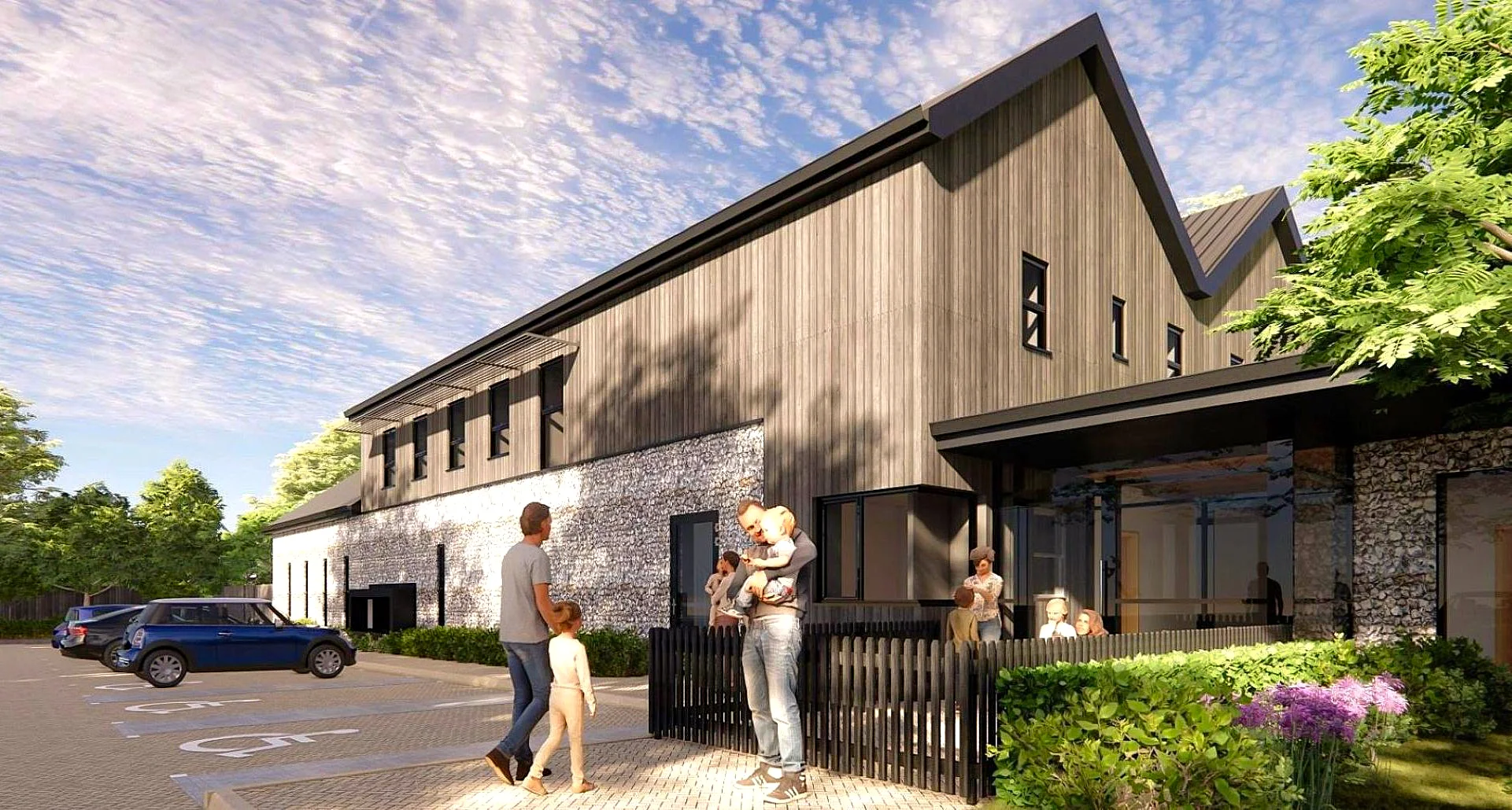 The building has a flint base to the public areas and brick to the private spaces. The upper floors are clad in black stained timber, similar to the local agricultural barns.