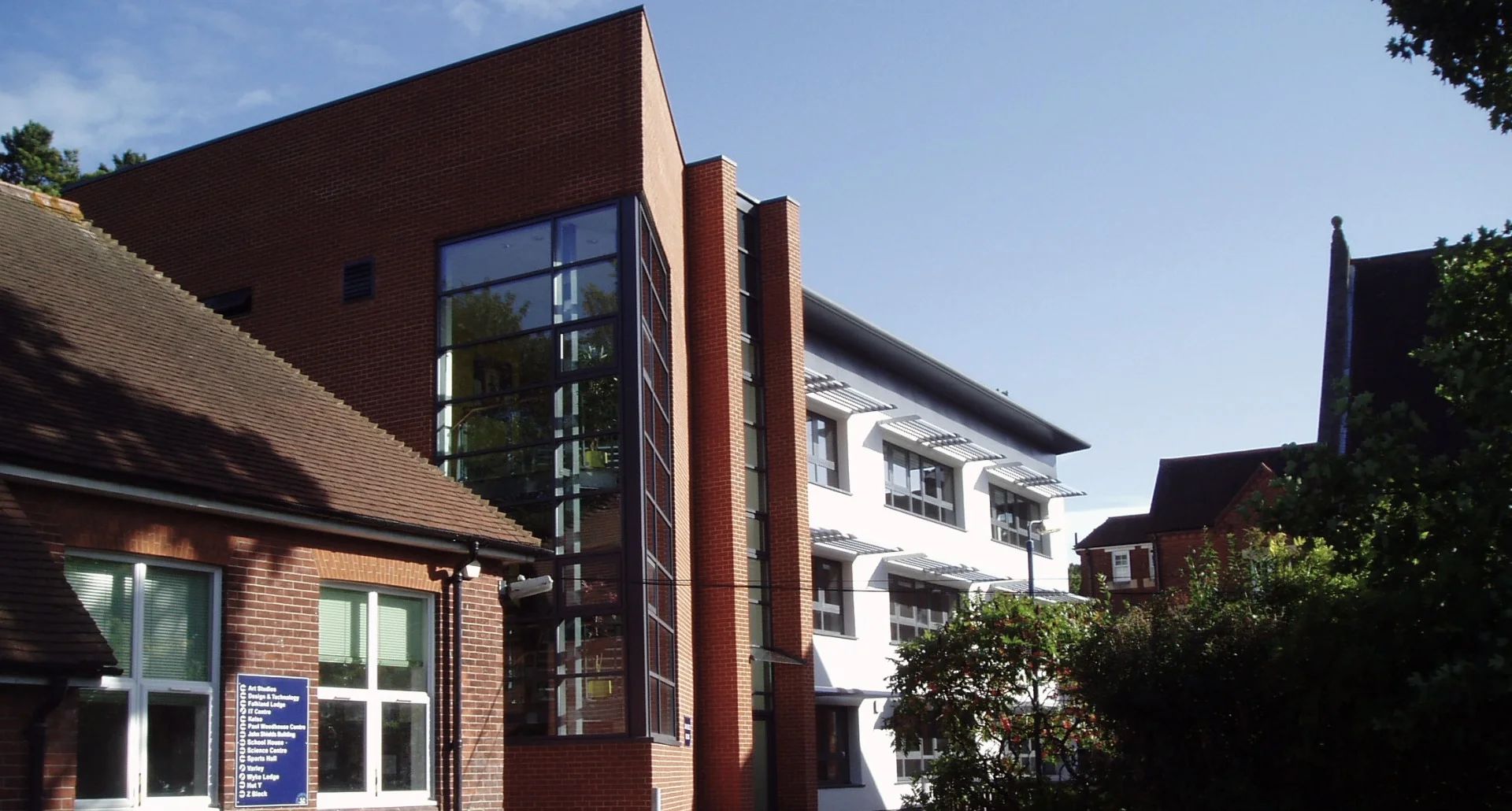 The plan form is based around an east / west central axis, with classrooms leading off either side with lockers along its length, facing north and south. The main staircase, with glazing to its full height, emphasises the entrance and offers dramatic views over the campus.