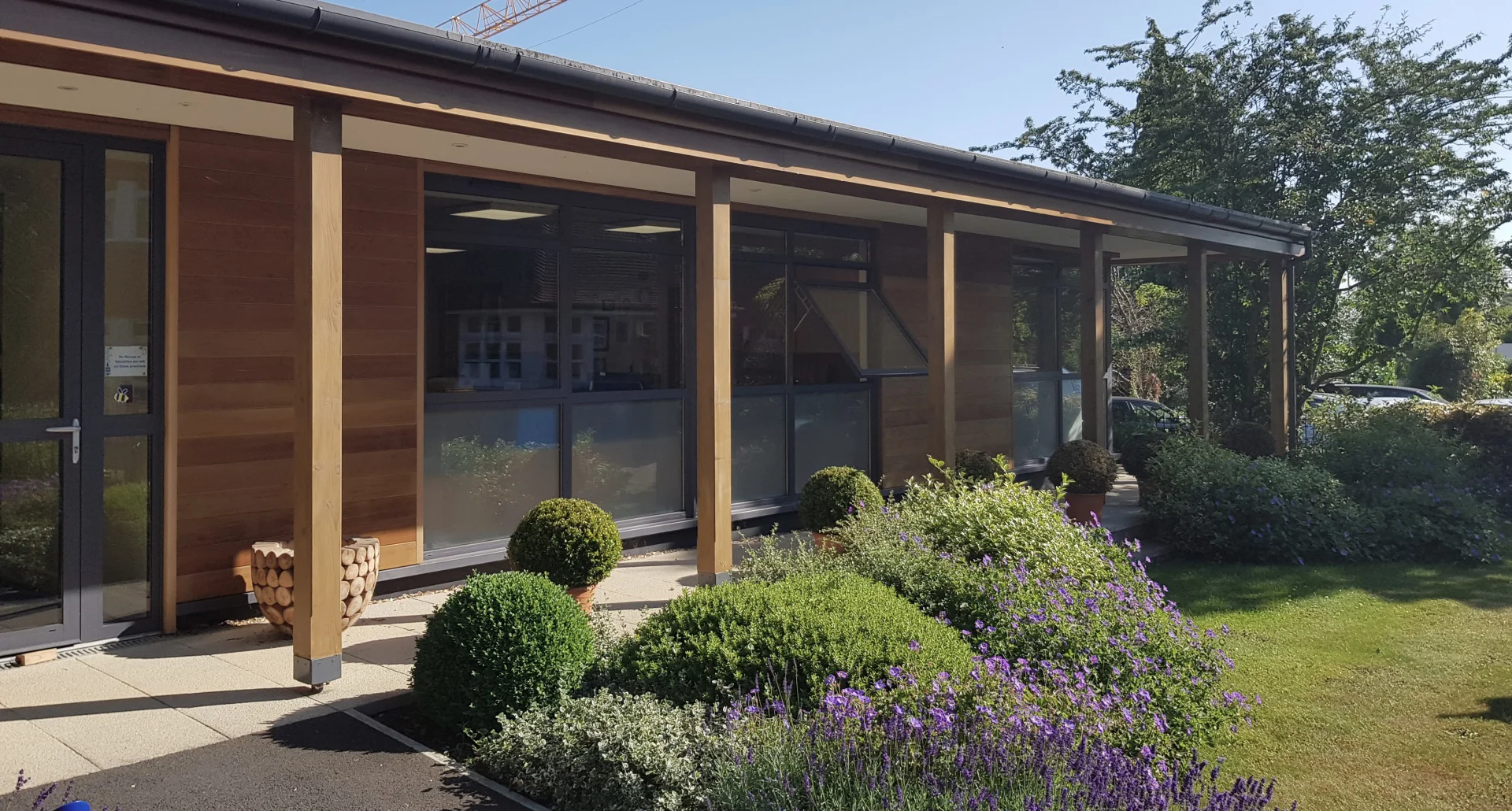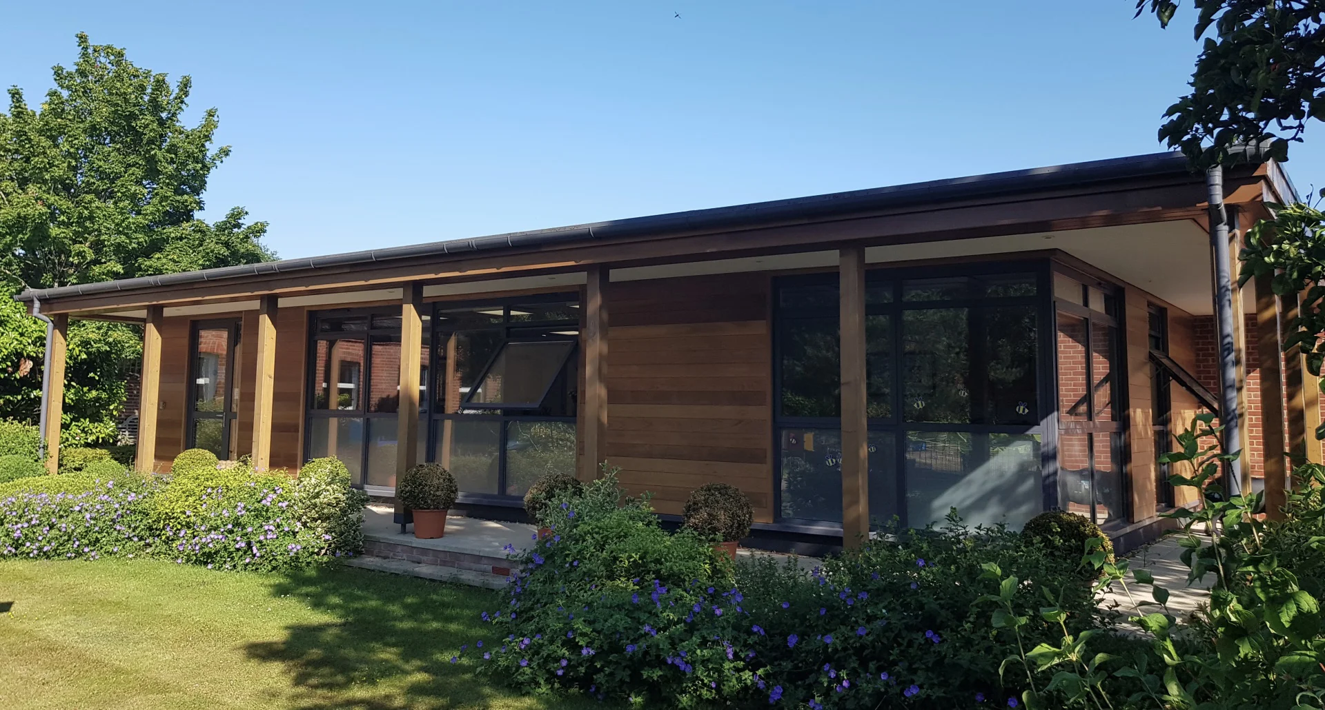 The new building is intended to give the impression of a garden pavilion, sitting on the edge of the lawn of the adjacent large detached house. Accordingly, it does not try to compete with the heavy masonry forms of the existing buildings. It touches the ground lightly and is contemporary in detail and clad primarily in horizontal timber. The large areas of glazing maximises the use of natural light and ventilation, and the veranda which runs around two sides of the building reduces solar gain and glare.
