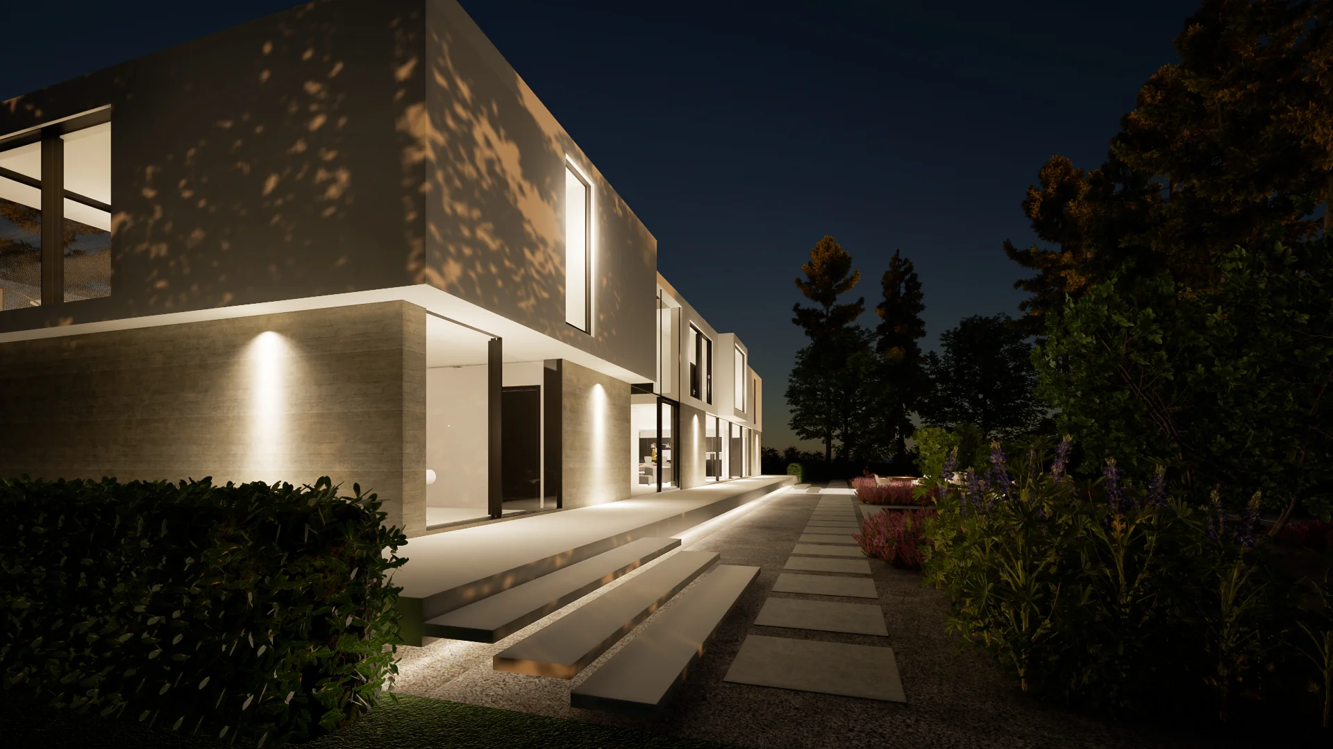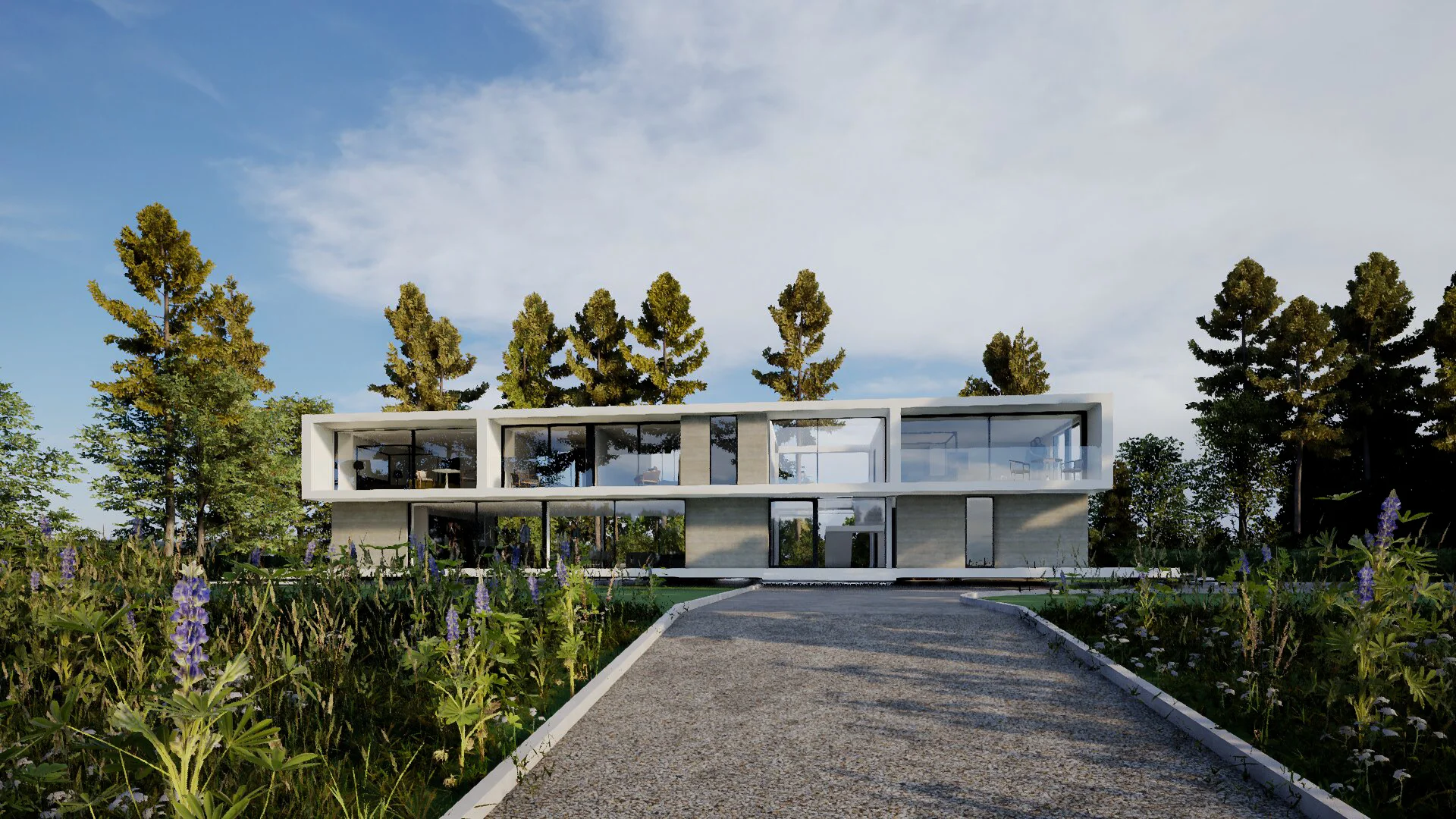 Materials are polished concrete cladding to the ground floor to provide a robust, textured façade with white render above. The light colours continue on the raised deck, balconies and projecting roof.