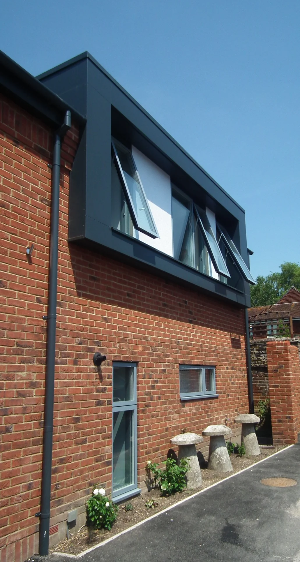To minimise the impact on the neighbours the building is part single and part two storey and the bulk of the building is kept as far away from the neighbours as the site permits. The eaves level is also kept low.