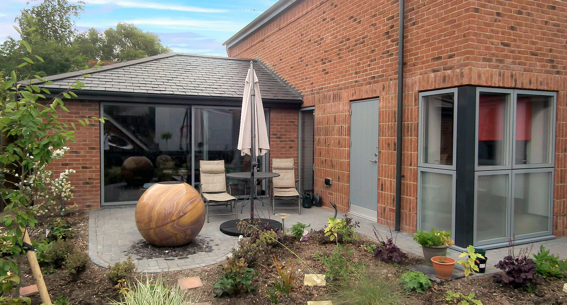 The materials echo the local character with red brick, render and slate, but the approach is a mix of traditional and modern characterised by the aluminium projecting bay window to the first floor and brick specials used in the eaves detailing.