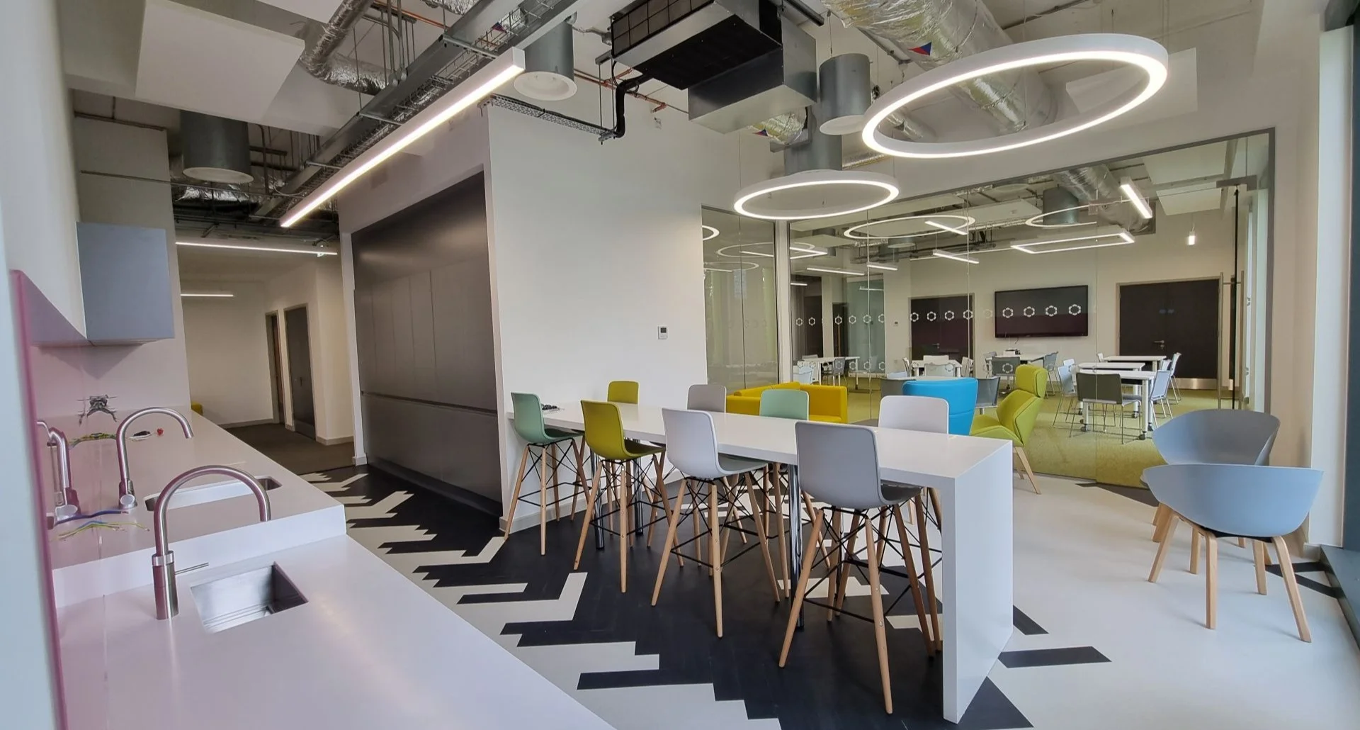 The building enables this by providing a variety of spaces for research and commercial activities together with areas for meeting, presentation and informal gatherings, including meeting rooms, multi-use spaces, coffee bar and corridor booth seating with large scale markable walls to enable ad-hoc discussions and promote the sharing of ideas.