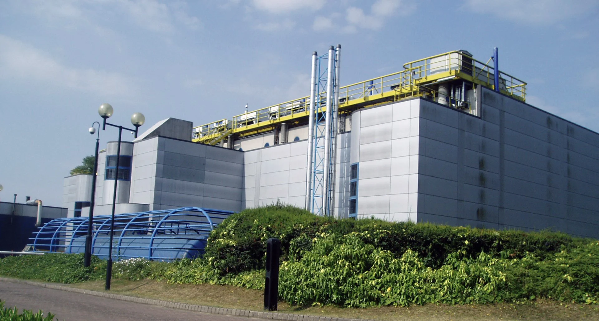 The majority of the exposed plant is screened from the road and the extensive banks of louvres are picked out in blue which had been used extensively in the original building.