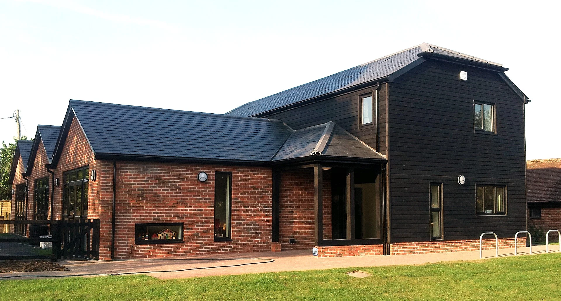 The building reflects the adjacent existing farm buildings and is traditional in form and finish which was a requirement of the local authority. The main two storey body of the building reflects the local black timber clad barns and contain the office, kitchen and ancillary spaces at ground floor level, with the Baby Room and staff rooms to the first floor.