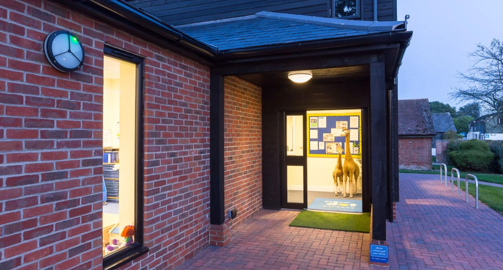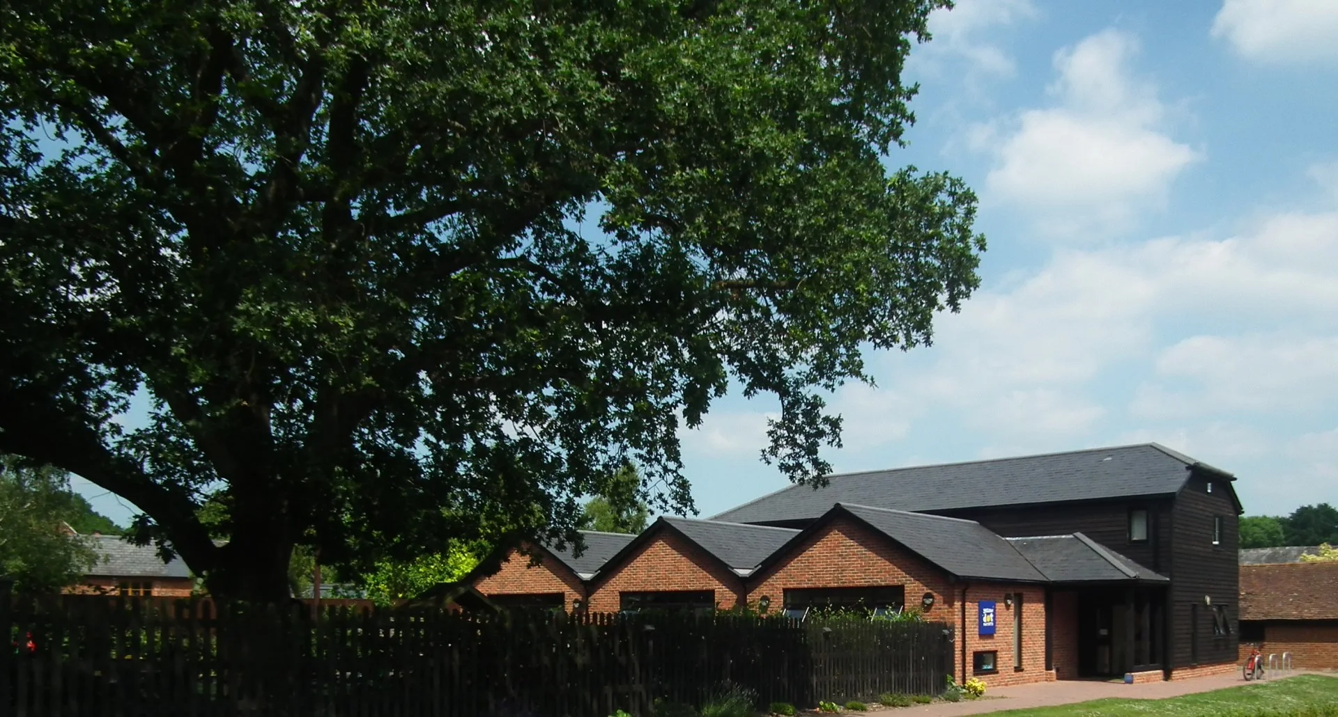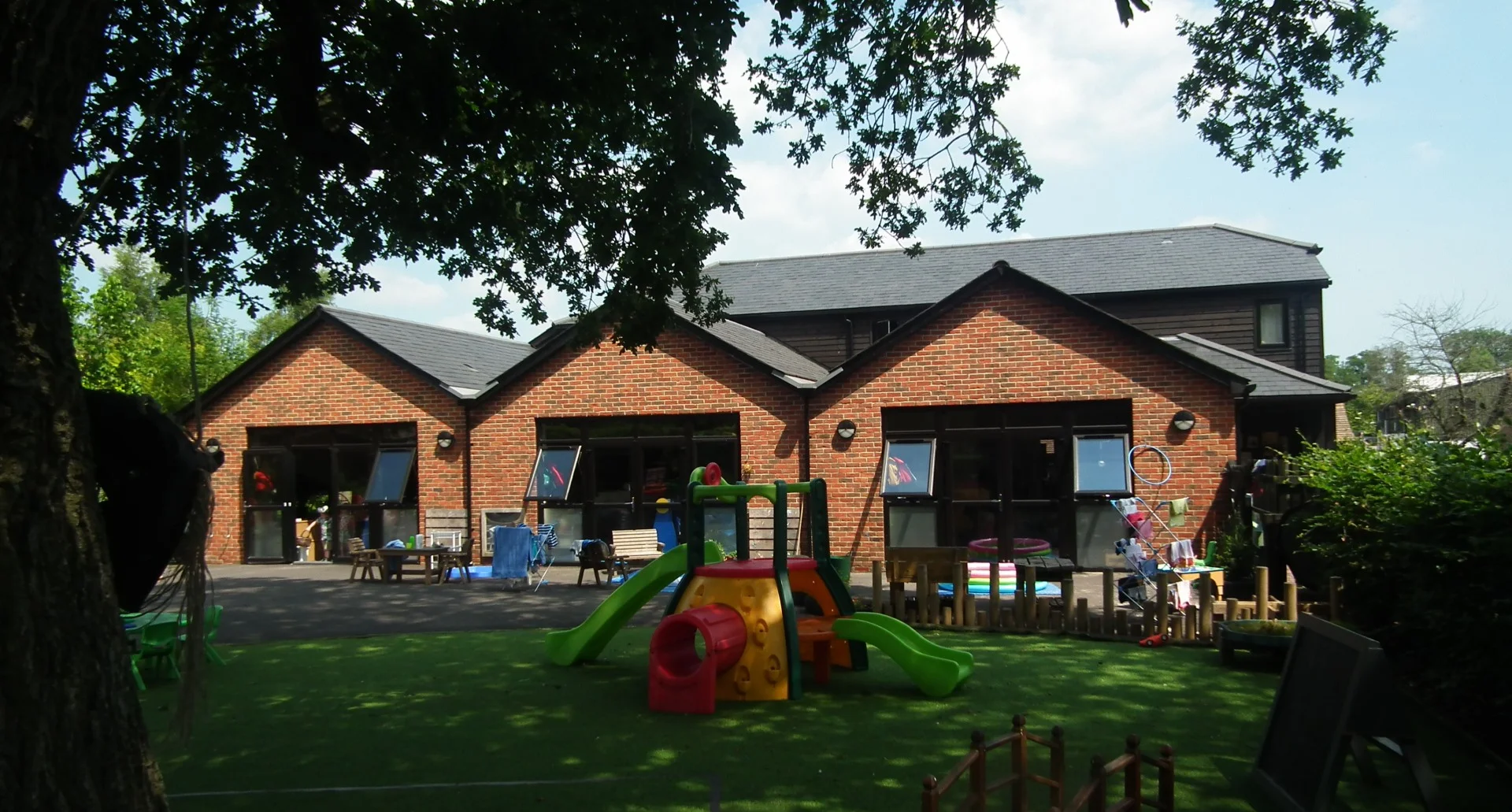 A mature oak tree dominates the centre of the play space and impacted upon the siting of the Nursery. It benefits the nursery by providing shade as well as a strong visual presence and also by mitigating the impact of the adjacent main road as well as the view from the main road, permitting only angled glimpses between undergrowth and canopy.