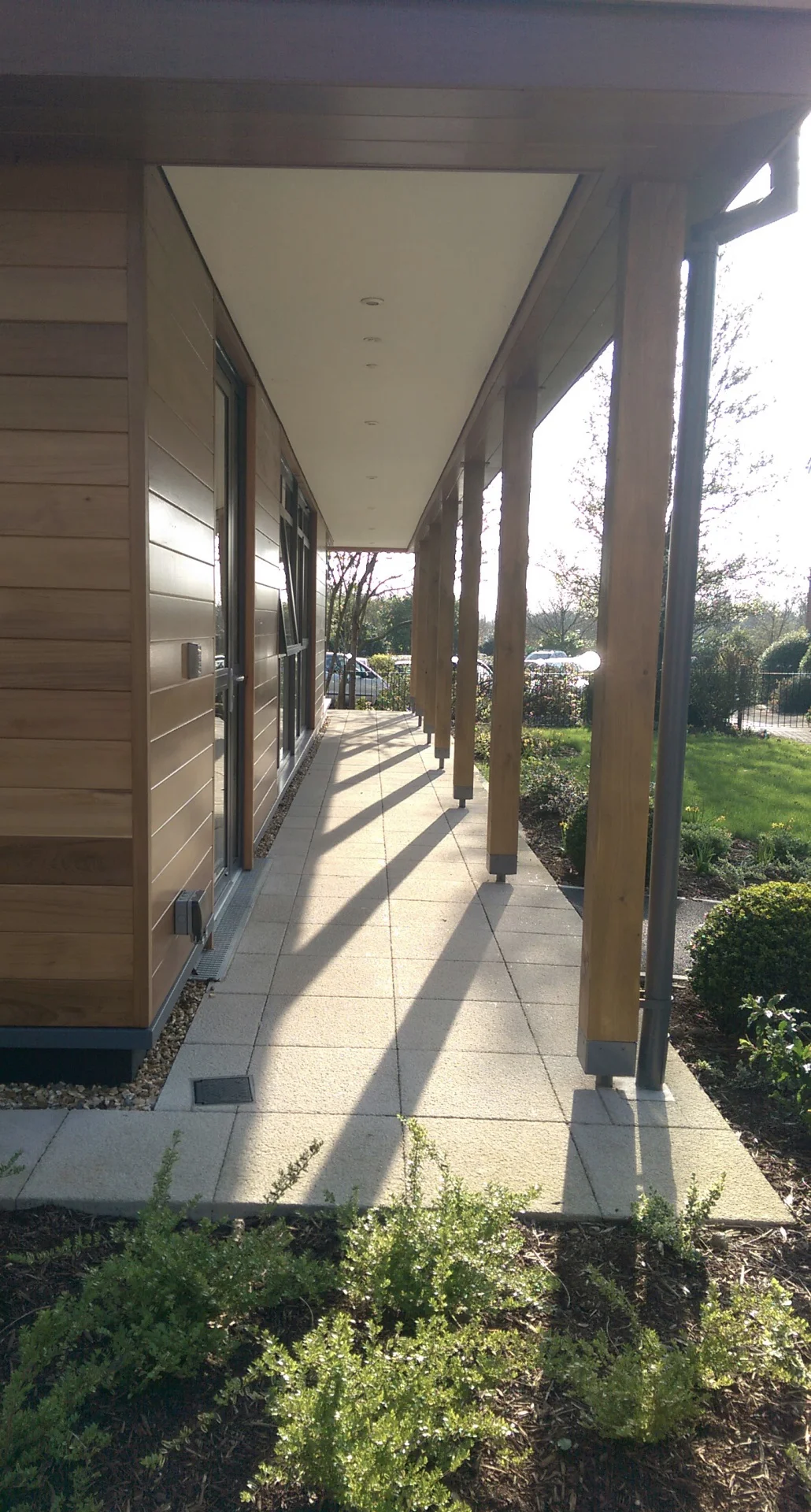 The new building is intended to give the impression of a garden pavilion, sitting on the edge of the lawn of the adjacent large detached house. Accordingly, it does not try to compete with the heavy masonry forms of the existing buildings. It touches the ground lightly and is contemporary in detail and clad primarily in horizontal timber. The large areas of glazing maximises the use of natural light and ventilation, and the veranda which runs around two sides of the building reduces solar gain and glare.